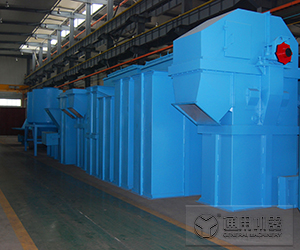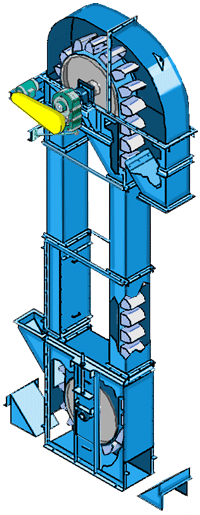 斗式提升機由料斗、驅動裝置、頂部和底部滾筒(或鏈輪)、膠帶(或牽引鏈條)、張緊裝置和機殼等組成。工作時料斗把物料從下面的儲藏中舀起,隨著輸送帶或鏈提升到頂部,繞過頂輪后向下翻轉,將物料傾入接受槽內(nèi)。