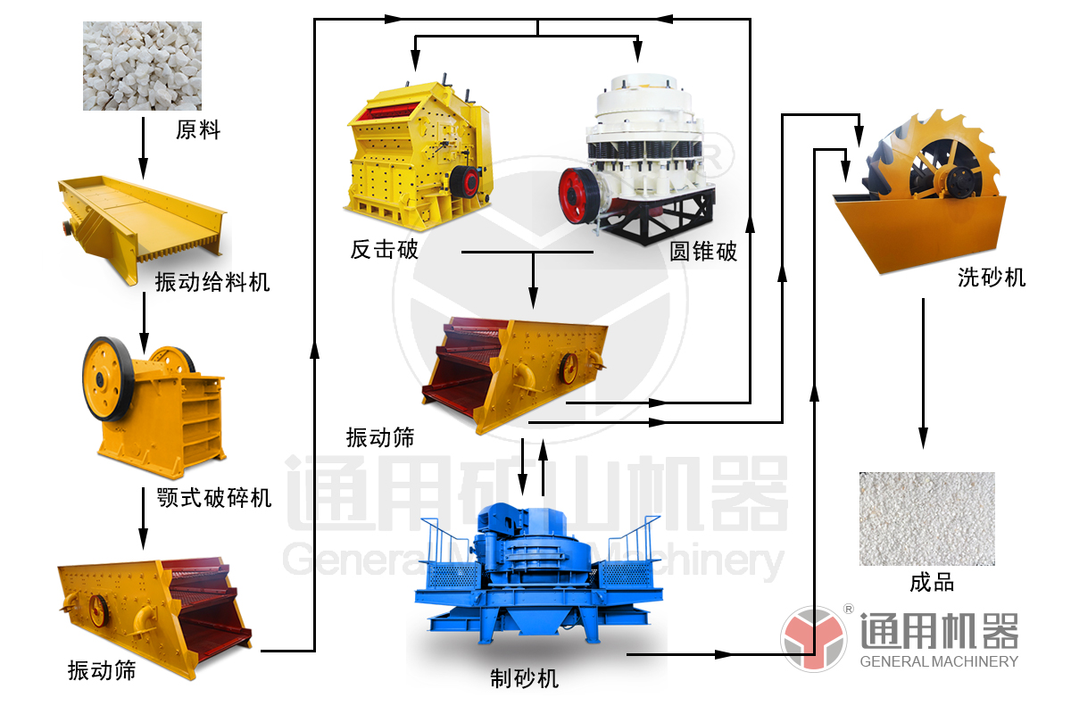 首先,石料由粗碎機(jī)進(jìn)行初步破碎,然后,產(chǎn)成的粗料由膠帶輸送機(jī)輸送至細(xì)碎機(jī)進(jìn)行進(jìn)一步破碎,細(xì)碎后的石料進(jìn)振動(dòng)篩篩分出兩種石子,滿足制砂機(jī)進(jìn)料粒度的石子進(jìn)制砂機(jī)制砂,另一部分返料進(jìn)細(xì)破。進(jìn)制砂機(jī)的石子一部分制成砂,經(jīng)洗砂機(jī)(可選)清洗后制成成品砂,另一部分進(jìn)制砂機(jī)再次破碎。